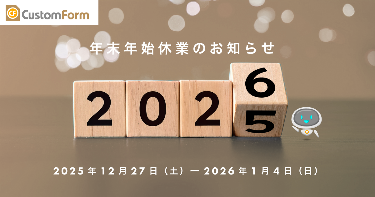 CustomForm事務局は、12月 27日(土)~1月 4日(日)まで年末年始休業をいただきます。